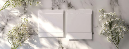 a mockup featuring two blank white invitation cards placed side by side on a light marble surface, with white flowers, captured from a top view, generous space for text or design elements