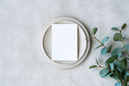 Blank wedding card invitation mock up with natural leaves for decorated background, minimal design card, generative Ai