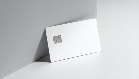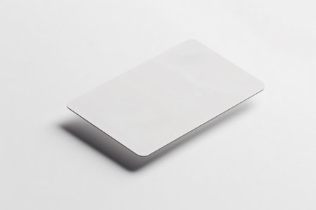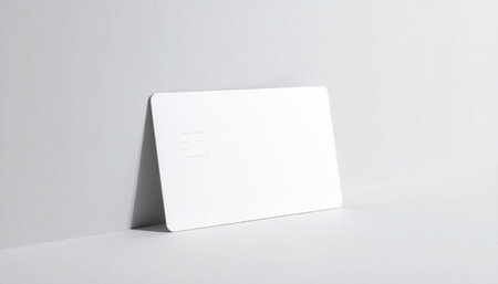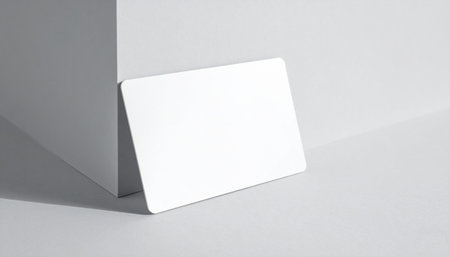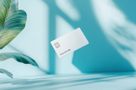 Elegant mockup of a blank white credit card against a soft pastel blue background with natural light