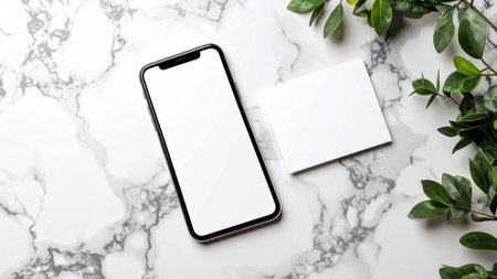 A clean white square card rests on a marble background with vibrant green leaves and elegant silver accessories.