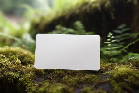 A white card with a blank sheet of paper stands against a backdrop of lush green leaves.