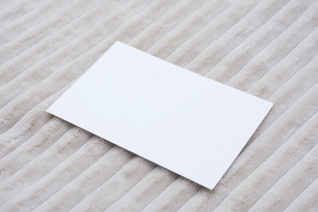 Minimalist mockup of a blank greeting card on a soft beige textile blanket. Template for showcasing invitation design, wedding stationery, holiday greetings, birthday cards, and Christmas celebration messages.