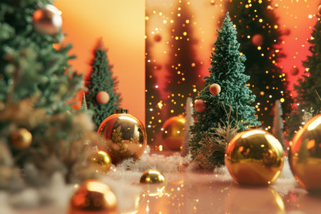 Stunning display of Christmas ornaments and decorations featuring a golden tree, shimmering baubles, and a blue marble gift box, perfect for holiday joy.