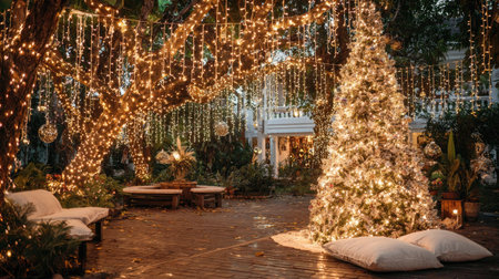 This enchanting outdoor Christmas scene features a beautifully decorated tree surrounded by twinkling fairy lights, offering a warm and inviting atmosphere for holiday gatherings.