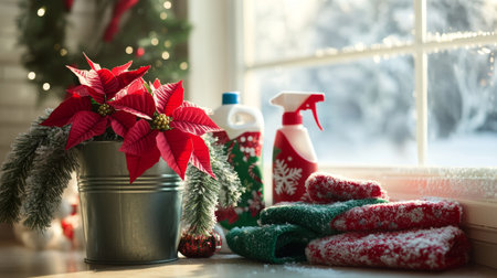 Red poinsettia and cleaning products on wooden surface near window.