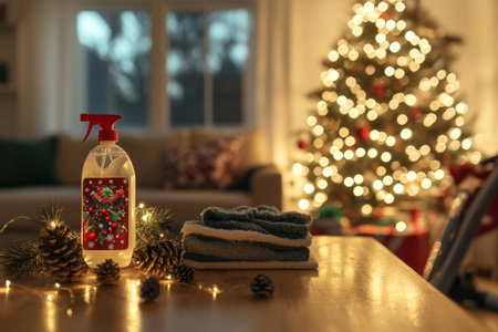 A festive cleaning spray bottle stands beside towels and pine cones on a wooden table, with a glowing Christmas tree in the background.