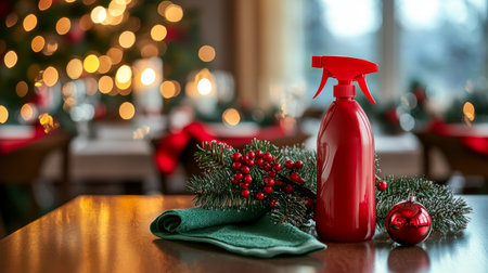 Red cleaning spray, green cloth, and Christmas decorations on wooden table.
