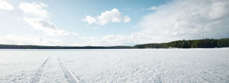 Frozen lake and blue sky with white clouds. Winter landscape.