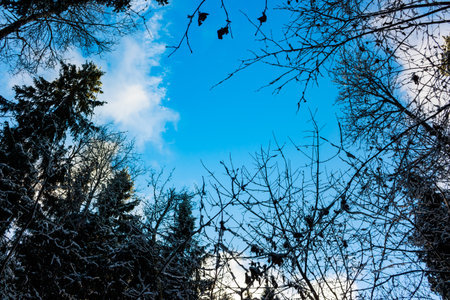 Bare tree branches and dark evergreens frame a vivid blue sky with scattered white clouds in a winter forest scene