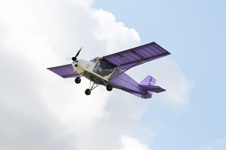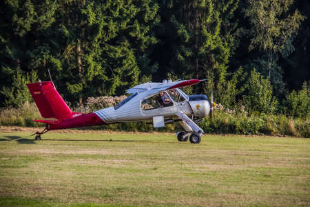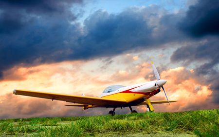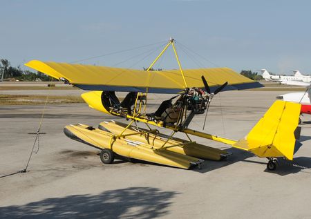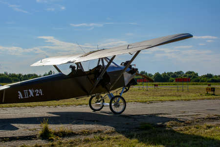 Ultralight single-engine single-seat aircraft stands on the airfield in the early morning.