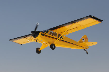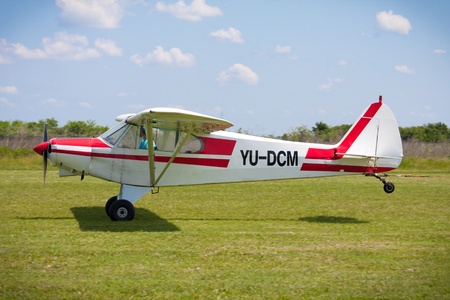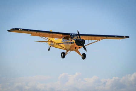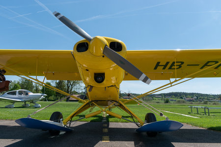 Lommis, Switzerland, May 11, 2022 Piper PA18-150 Super Cub propeller plane on a small airfield