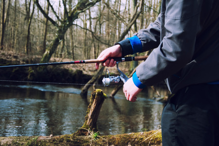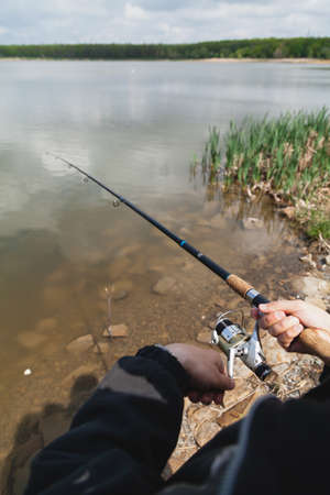 Fisherman is fishing on a spinning. Fisherman's hands with a fishing rod. Cloudy day, outdoor nature with river.