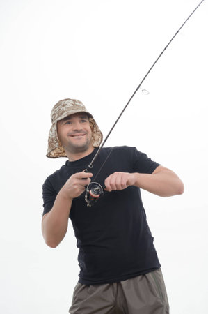 Half-length portrait of excited fisherman catching with the help of his spinner big fish Isolated on the white background