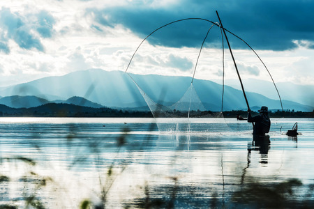silhouette of fisher man use square dip net fishing at lake with mountain and blue sky background