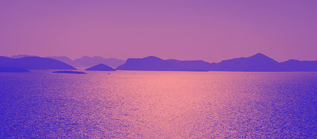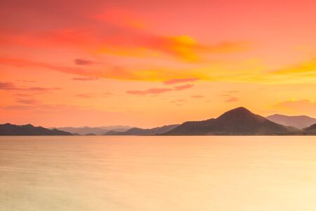 Sunset over the sea. Landscape with lake and mountains.