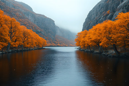 Vibrant orange autumn trees line a tranquil river in a misty mountain valley, creating a serene and picturesque landscape. the calm water reflects the colorful foliage, adding to the peaceful ambiance of the scenery. Generative AI