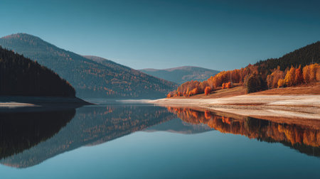 A tranquil autumn landscape featuring vibrant trees reflecting on still water, surrounded by serene mountains under a clear blue sky, perfect for nature lovers.