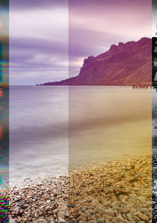 Glitched illustration. Random colorful digital signal errors in front of nature landscape. Trendy computer graphic for poster, postcard, application or music album.