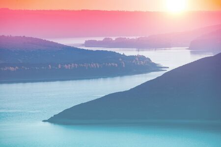 Beautiful evening landscape. River with rocky hills at sunset in autumn. Beautiful nature