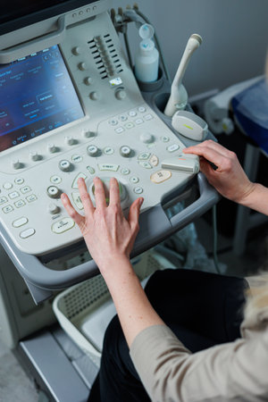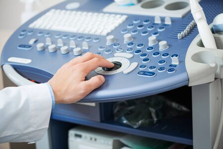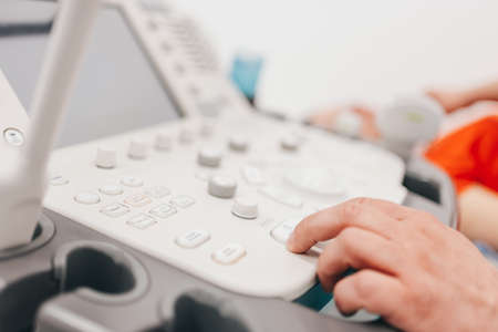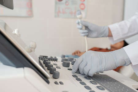 Close up cropped shot of modern medical device, ultrasound machine scanner at work. Hand of professional female doctor sonographer pushing buttons on ultrasound control panel.