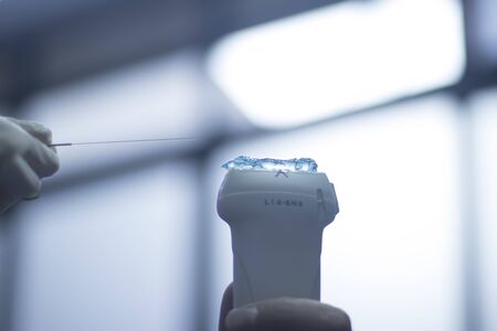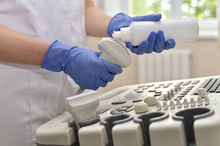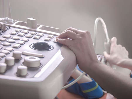 Doctor sets up an ultrasound machine, hand close up. Analysis, diagnosis of the condition of the disease using ultrasound scanning