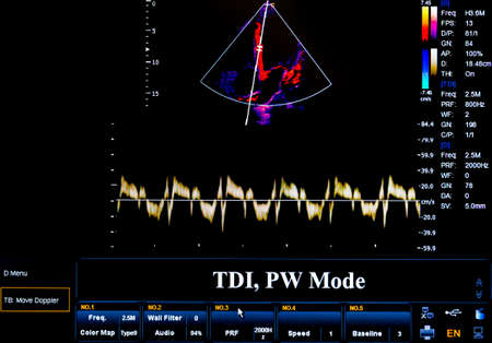 Modern echocardiography (ultrasound) machine monitor. Colour image. New hospitl equipment. TDI, PW Mode.