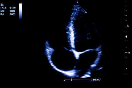 Colourful image of modern ultrasound monitor. Ultrasonography machine. High technology medical and healthcare equipment. Ultrasound imaging used in medicine. Human heart. Four chambers.