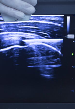 Ultrasound assisted ecography on screen showing intratissue percutaneous electrolysis dry needling physical therapy rehabilitation physiotherapist treatment in hospital medical center IPE physiotherapy clinic.