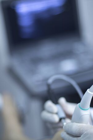 Selective focus on ultrasound scanner device in hand of professional doctor examining closeup
