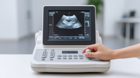 A close-up view of a hand adjusting settings on an advanced ultrasound machine while displaying an image of a fetus, set in a clean medical environment for healthcare use.