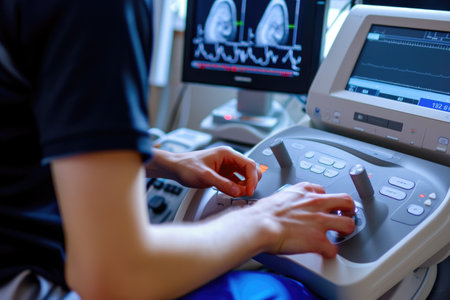 A person is seen operating a machine in a room, demonstrating their skills and expertise, Portable ultrasound device in use, AI Generated