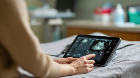 A portable ultrasound device is being used at a bedside displaying realtime images of a patients abdominal structures on a clear touchscreen interface