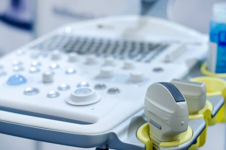 Modern ultrasound machine in clinic laboratory of sonography diagnostics.