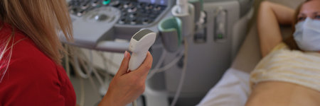 Gynecologist doing ultrasound scan on belly, doctor examining womans baby