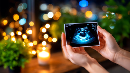 Holding a precious early ultrasound image, a symbol of new life and the beginning of a beautiful journey. The soft bokeh lights create a warm and intimate atmosphere, capturing the joy and anticipation of parenthood.