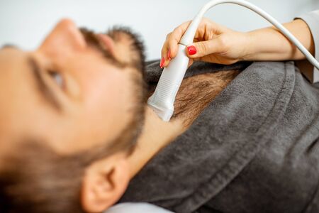 Men examining his thyroid with ultrasound sensor, lying in bathrobe on the couch at the medical office