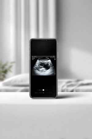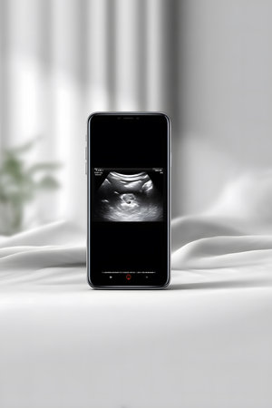 Vertical minimalist composition featuring ultrasound screen with baby scan image on smartphone, soft blur effect, creating a serene and modern atmosphere for visual storytelling