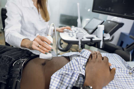 Cropped close up image of ultrasound scanner device in the hand of a professional female doctor examining young African man patient, doing abdominal ultrasound scanning sonography.