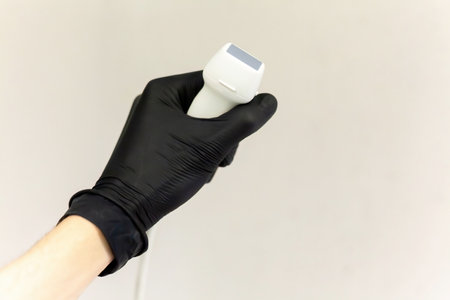 Close-up of a doctors hand wearing a black sterile latex glove holding a modern ultrasound probe isolated on gray background, man, one person. Ultrasound medical procedure symbol, simple concept