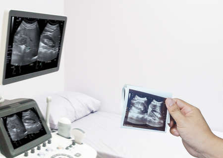 Ultrasound image pregnant baby photo. Blue, pink ribbon with ultrasound pregnancy picture on white background. Concept of pregnancy, maternity, expectation for baby birth