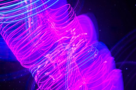 Pulsating neon lines in darkness. Flow of light art.