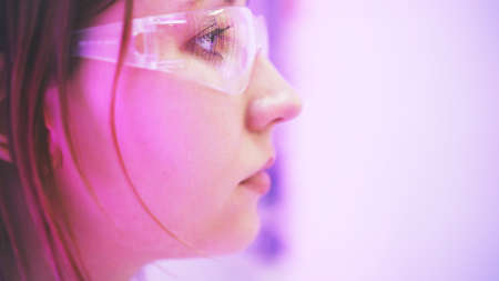 Portrait of young girl in glasses holding light sticks in red and blue neon in studio.