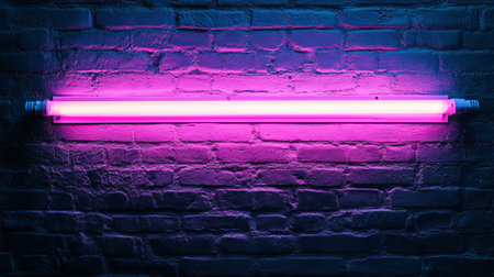 Sleek industrial vibe meets vibrant neon glow in this eye-catching photo of a hanging light bulb against a textured brick wall. Generated A.I.