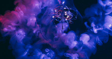Smoke drop defocused. Neon light glow. Purple violet shiny fluid exploding in broken glass. Garland fume paint color abstract black background.