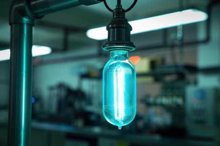 Modern designer blue lightbulb is hanging in a workshop setting, casting a cool blue light