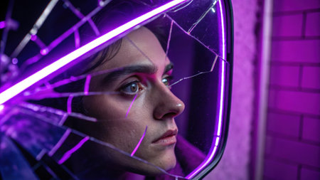 The reflection in the fragmented mirror is an intense gaze surrounded by sharp jagged lines and glowing neon purples that provide a fierce contrast to the delicate features.