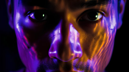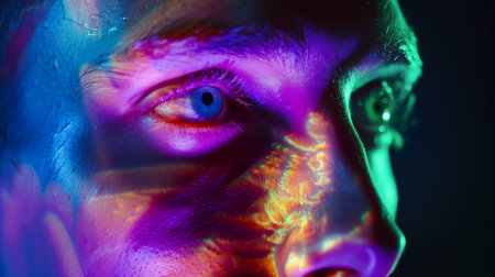 A mans face is illuminated by blue and pink light, creating a dramatic effect