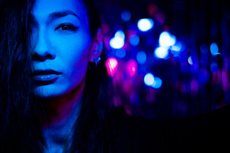 Portrait of a transgender model in a studio with neon lighting.