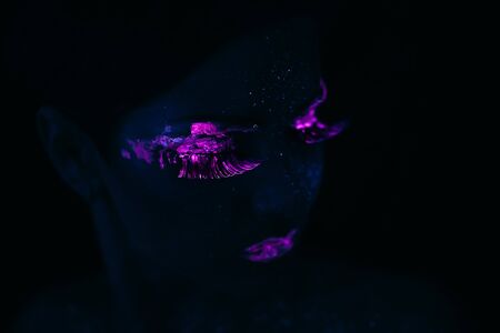 Portrait of Beautiful Fashion Woman in Neon UF Light. Model Girl with Fluorescent Creative Psychedelic MakeUp, Art Design of Female Model in UV, Colorful Abstract Make-Up