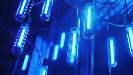 Laboratory equipment glowing blue in a modern research facility